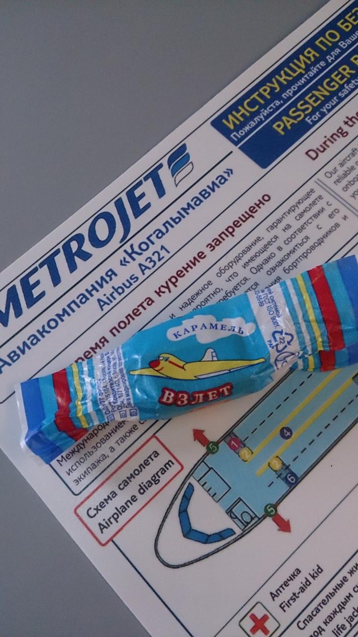 Посадка неожиданно началась и закончилась минут на 20 раньше. Впервые зашли в самолёт самыми первыми. Самолёт был заполнен всего лишь на четверть. Летели мы Когалымскими авиалиниями (более красивое название — Metrojet), при взлёте выдали конфетку «Взлёт»