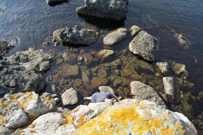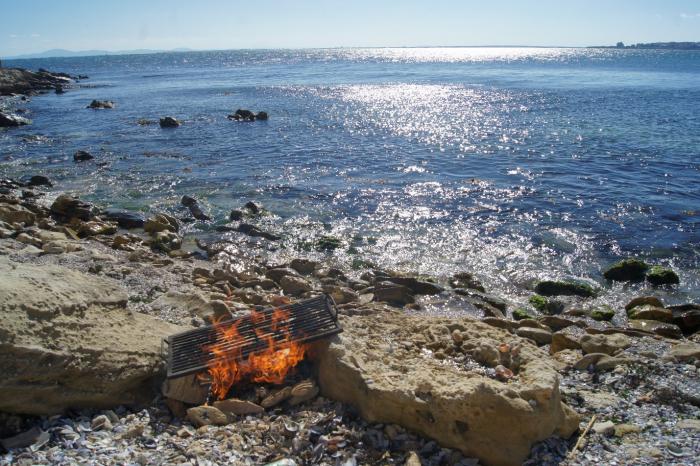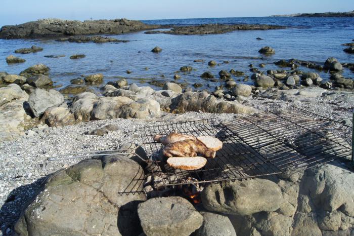 Каменистый дикий пляж, прозрачнейшая освежающая вода, пригревающее солнце, безветренная сторона. По традиции компанию нам составила очаровательная одинокая нудистка. Чтобы не очень смущать её, мы отошли подальше (насколько это было возможно). Короче, место оказалось удачным во всех планах. Выпив по пивку, мы начали собирать дрова для костра, параллельно купаясь и рассказывая различные истории о путешествиях. Соорудив кострище и поставив на него решетку, мы пожарили мясо. Через какое-то время Лёша сходил за своей собакой, которая дрыхла в машине. Я никогда не видел, чтобы таксы так плавали, да ещё и ныряли за камнями. Очень забавно.