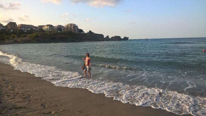 Были очень голодные, а также хотелось уже потрогать моречко. Пошли искать еду и пляж. Нашли все в одном месте. В уютном пляжном приотельном ресторанчике съели шопский салат, куриный стейк в сливочно/сырном блючиз соусом (данный соус взяли на заметку для домашних кулинарных изысков), котлета из свински с гарнитурой, которая оказалась корейкой с гарниром, запили всё местным пивком.