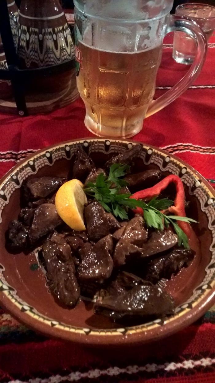 Вечерело, и мы решили заглянуть в национальный ресторан «механа Странджа» выпить ракии и пива, ну и поужинать заодно. Заказали мне стейк из свинюшки, а Анечке утиные сердечки.