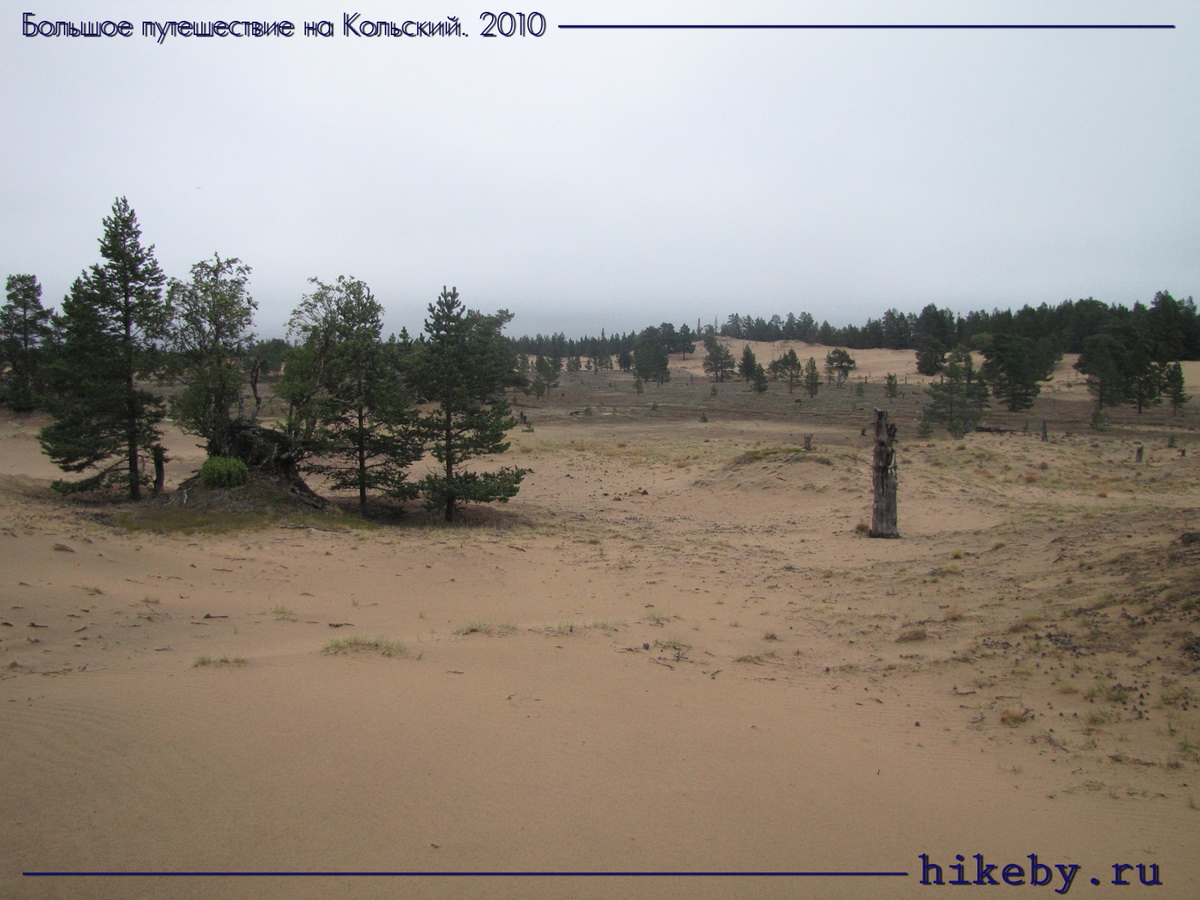 …по грунтовке стараемся держать шестьдесят в час. Встречных или попутных машин практически нет. Один раз пролетает колонна из L200 – как мы убедились, довольно популярная машина среди любителей дорожных путешествий. Около девяти вечера на развилке Варзуга-Кузомень сворачиваем направо, и практически сразу грунтовка под колесами Паджеро меняется на желтый песок. Пять минут и мы въезжаем в Кузоменские пески – самую северную на планете пустыню (если верить Вики, возникшую искусственным образом из-за вырубки прибрежных лесов в 19 веке и сильных ветров с моря).