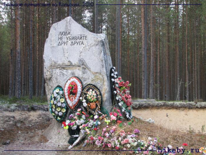 «Сандармох» – место расстрела тысяч невинных людей в годы «царствования» НКВД. Там очень-очень тихо, немного жутковато и ощущение, как будто до сих пор не нашли покоя души умерщвленных здесь мужчин, женщин и детей более чем пятидесяти национальностей. Среди стройных сосен просевшая земля и фотографии, фотографии, фотографии… «Люди, не убивайте друг друга».