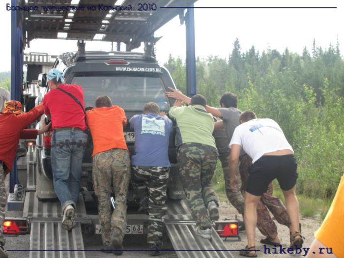 Ровно в полдень, у пустующего поста ДПС напротив отворота на Чупу мы видим столпотворение народу и уже знакомый «китаец». Естественно, останавливаемся. Оказывается это чудо китайского автопрома умерло и не желает заводиться. Ребята перебрали в нем всю электронику, протащили его на тросе уже с сотню километров, а теперь вот тормознули автовоз и договариваются о доставке машины до Питера. Рядом еще два экипажа, возвращающихся домой. Общими усилиями закатываем GreatWall на автовоз, после чего мы перекидываем свои вещи в «китаец», а к себе на борт берем Стаса (в кабине автовоза место только для двоих, и то один лежа). Очень кстати пришлись два дополнительных выдвигаемых кресла в багажнике Паджеро.