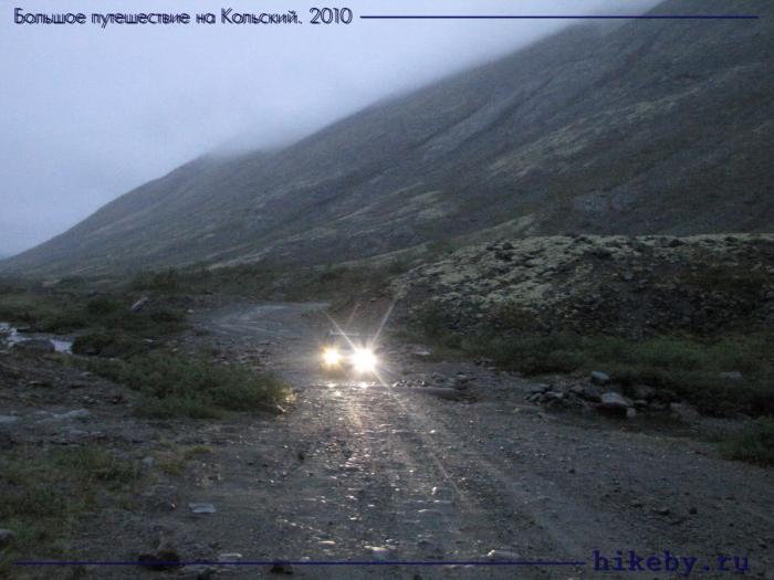 Повертевшись немного на перекрестках в Апатитах и Кировске, в конце концов в девять вечера проезжаем мимо поселка Кукисвумчорр и въезжаем в Хибины: сразу же асфальт заканчивается и начинается гравий. Через пару километров основная линия насыпи уходит вправо на карьер, мы же проезжаем прямо. Дорога начинает заметно ухудшаться. Бродов мало (фактически они только в начале и в конце), но из-за больших камней и сумерков быстро ехать опасаемся. Да еще эти разговоры про оползни в горах… И совсем уж скорость движения падает после того, как посреди дороги навстречу нам стоит полностью разбитая красная шестерка с оторванным передним мостом. Такую картину вполне ожидал бы увидеть где-нибудь на Кавказе, но никак не в Хибинах! А горы тем временем грозно смотрят на нас сверху, часто откуда-то из-за тумана, заставляя одновременно трепетать и восхищаться перед этой естественной первобытной красотой.