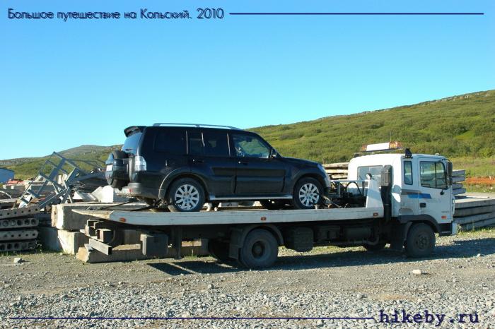 После выезда на трассу А-138 заруливаем в поселок Старая Титовка выпить по кружке кофе, после чего Алексей и ребята уезжают в Мурманск, а я остаюсь ждать эвакуатор. Одинокий молодой человек почти мгновенно привлекает внимание пограничников, и у меня проверяют документы, после чего просят оставаться на виду до приезда эвакуатора. Ждать долго не приходится, и уже через час мы с молчаливым водителем неспеша трясемся по перевалу в сторону Большого Озерка. По дороге выдергиваем из канавы ВАЗ с мужиками, пытавшимися проехать какой-то невероятной дорогой на «рыбные места». В восемнадцать часов вечера загружаем нашего раненного Паджерика на эвакуатор и сразу же отправляемся в обратный путь.