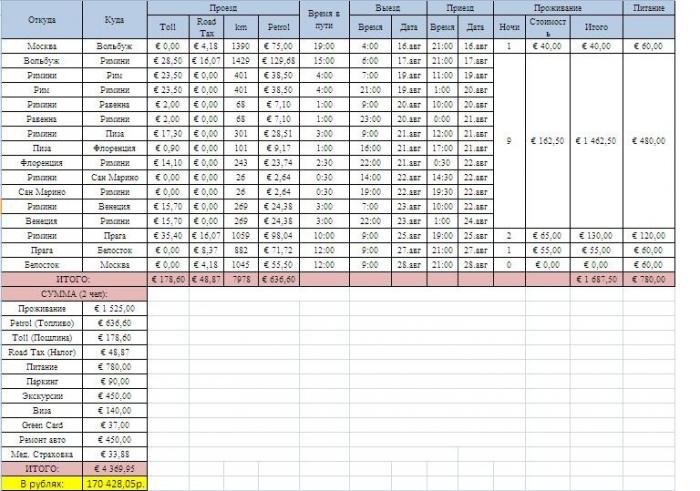 Более подробно запланированный маршрут и запланированный бюджет выглядит так (форма взята из отчёта одного из автопутешественников…уж очень она понравилась). В конце отчёта обязательно приведу фактические затраты:
