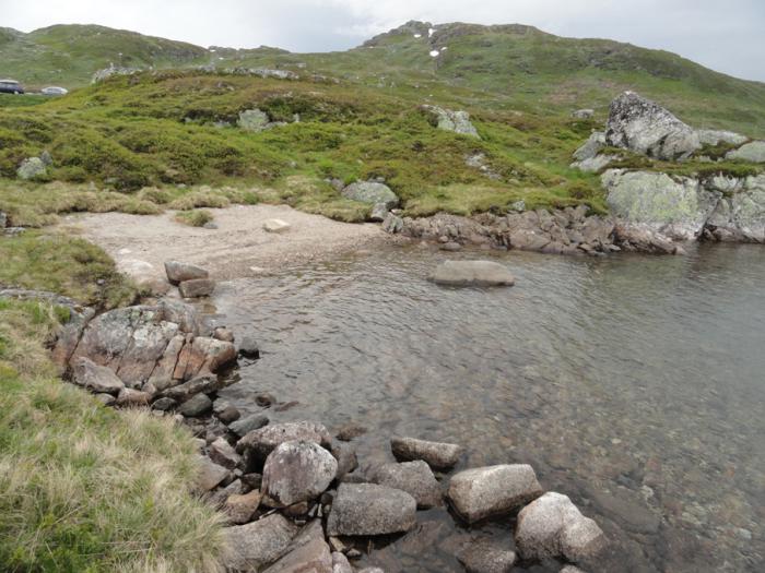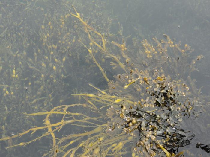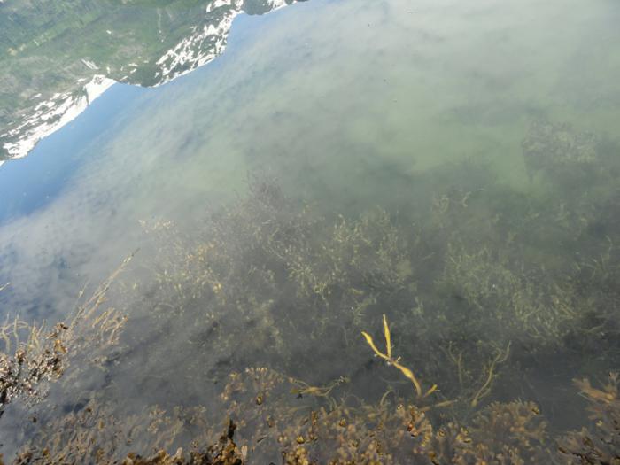 Вода во фьорде достаточно теплая, можно было бы даже искупаться, если б нашелся хоть малюсенький пляжик. Но берег везде обрывистый, скалы под водой сплошь заросли фукусами, плюс дорога в трех метрах над водой.