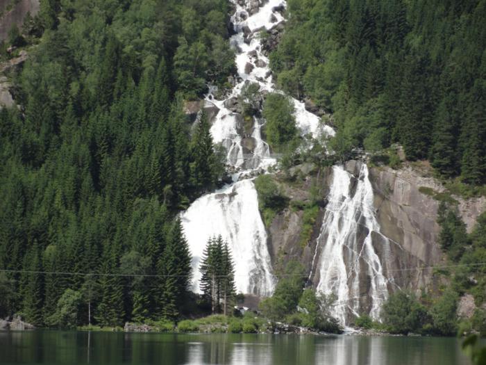 Добираемся до городка Одда (Odda), здесь фьорд кончается, но почти сразу начинается здоровенное озеро с зеленой водой.