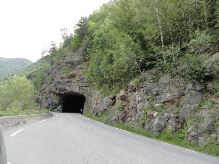Второй раз за поездку перед нами закрытый на ремонт тоннель. Фуры стоят рядочком у обочины, ждут, когда их пропустят через стройку, весь же остальной поток направляется по старой дороге, по серпантину через перевал. Длинный грузовик здесь просто не развернется – настолько крутые повороты. Ну, кривизна дороги хотя бы компенсируется красивыми видами )))