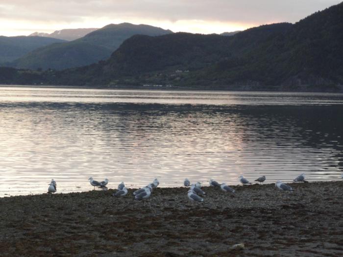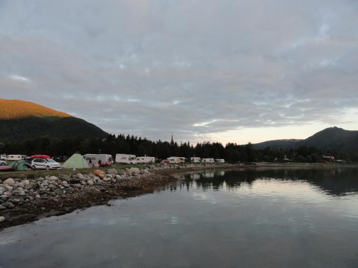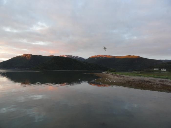 Rognan Fjordcamp находится на окраине Рогнана, прямо на берегу фьорда. Пахнет морем, шумят чайки, и никаких комаров. Хотя последнее не удивительно – к моменту нашего приезда (половина 12-го ночи) похолодало до +8. Почти час гуляли по берегу. Если бы не близкие горы, светило бы солнце, а так оно только подсвечивает вершины на другой стороне долины. Полярный день, солнце за горизонт не садится вообще.