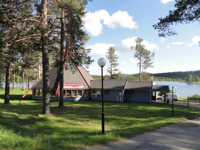 Арвидсъяур (Arvidsjaur), остановились перекусить в ресторане «Лапуня» (это мы его так прочитали; по-шведски – Laponia). Понравился и снаружи — большой вигвам в парке на берегу озера, — и внутри. Взяли по большому куску жареного мяса с гарниром и кофе.