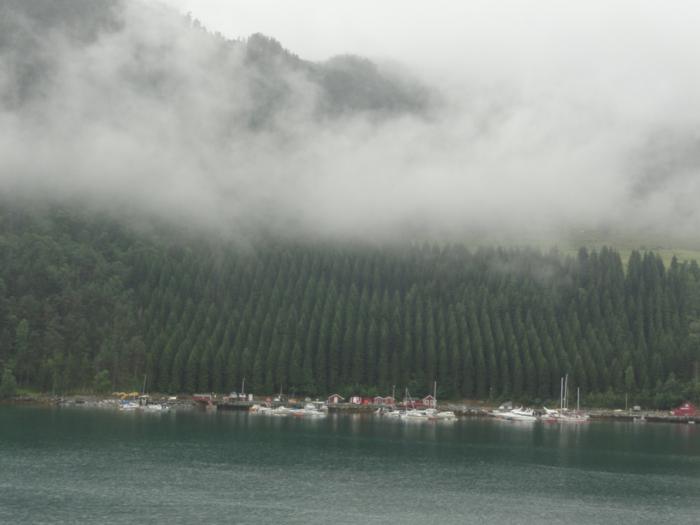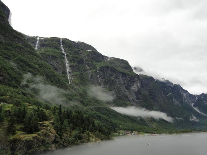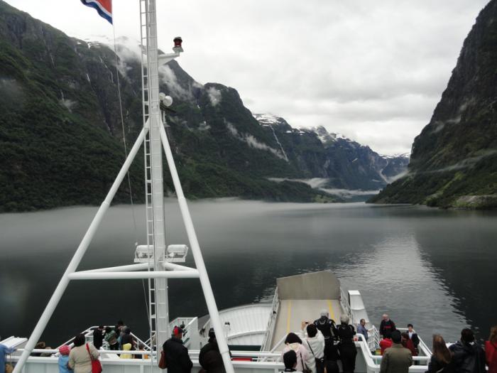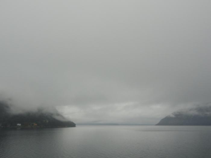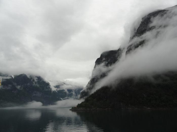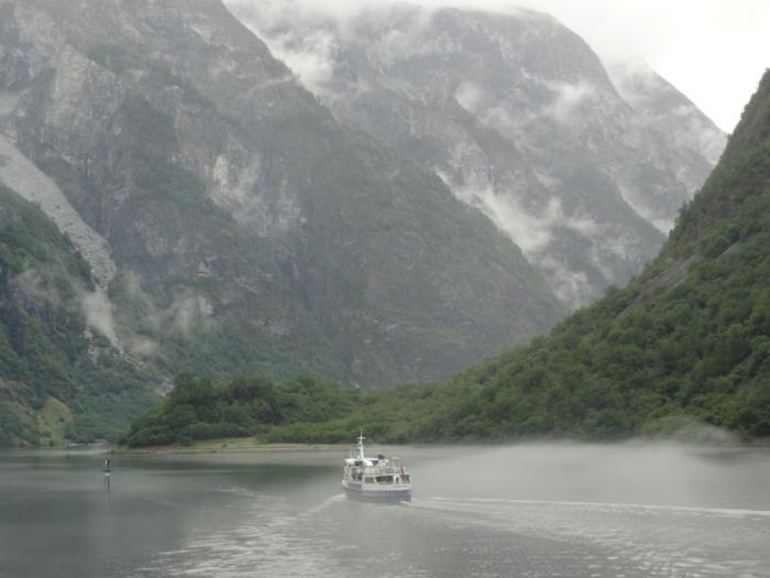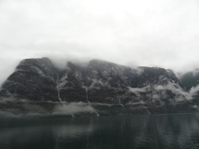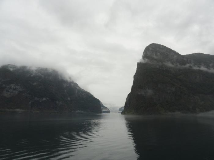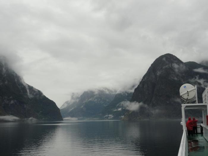 Переплыв Согнефьорд, входим в его рукав – Аурландсфьорд (Aurlandsfjorden). Облака поднимаются повыше, жмутся к берегам – в узком фьорде их сдувает.