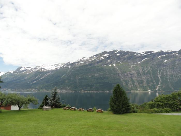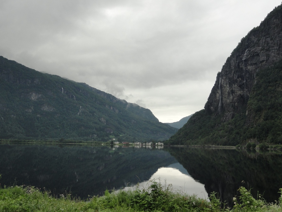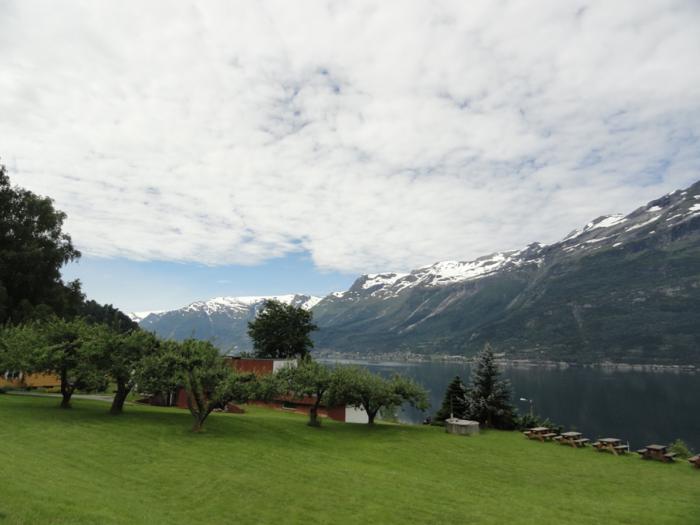 Вечер. Яркое солнце, всюду зелень, яблоневый сад под окнами, за ним синеет фьорд, негромкий шум водопада (водопад на самом деле мощный, просто от нас он прикрыт выступом горы; из центра города его хорошо видно, желающие могут к нему подняться, но зело высоко). Восхитительное место, так бы здесь и остались!