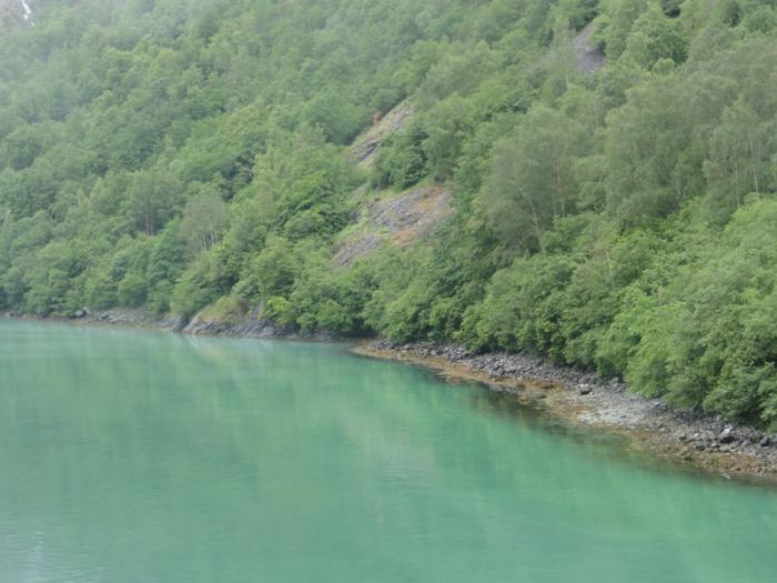 Вода на самом деле такого цвета, это не искажение фотоаппарата. Сквозь сине-зеленую воду фьорда просвечивает белый песок, получается такой изумительный цвет…