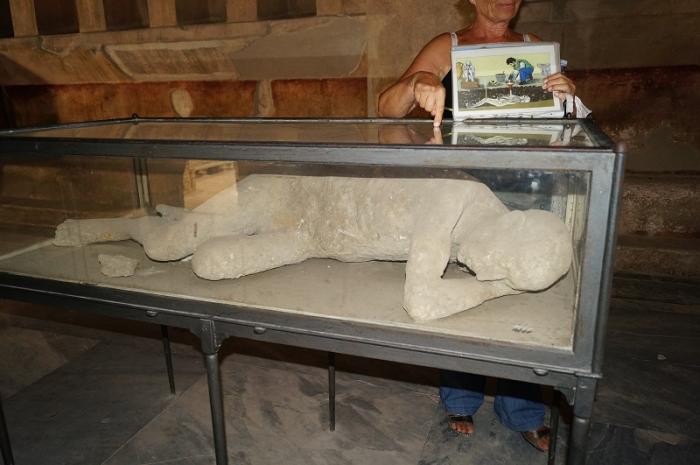 Эта группа людей с детьми пыталась добраться до моря, но не успела. Такие слепки археологи получили путем заполнения пустот, которые образовались от згоревших тел в затвердевшей лаве (ниже на фото это видно)