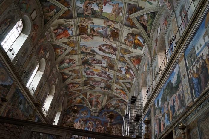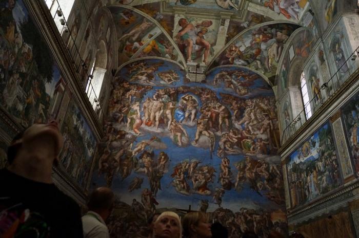 Ну и конечно, Сикстинская капелла — еще один обман зрения, воплощенный Рафаэлем. Обратите внимание на ноги мужчины вверху картины «Страшный суд», такое ощущение, что они прямо торчат из потолка.