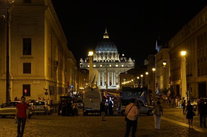 Полтора часа мы слушали эту зомбирующую службу, местами подпевали (такое караоке по-ватикански). Но пора отправляться за границу навстречу с вечерним Римом. В Собор мы опять не попали — вот он в ночных огнях.