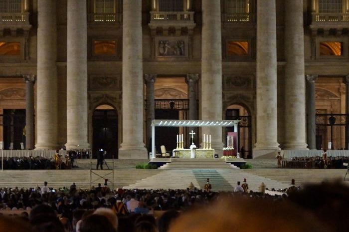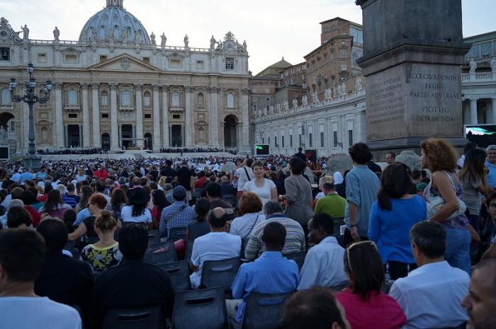 Попили чаю, полежали, отдохнули и снова в путь. Попробуем вечером попасть в Собор Св. Петра. Приехав на площадь перед Собором около 18-00, мы увидели, как толпы людей проходят через металлодетекторы и рассаживаются на площади по местам. Мы немного постояли и решили тоже зайти. На входе в зону с сиденьями нам выдали книги (еще один уникальный сувенир от типографии Ватикана).