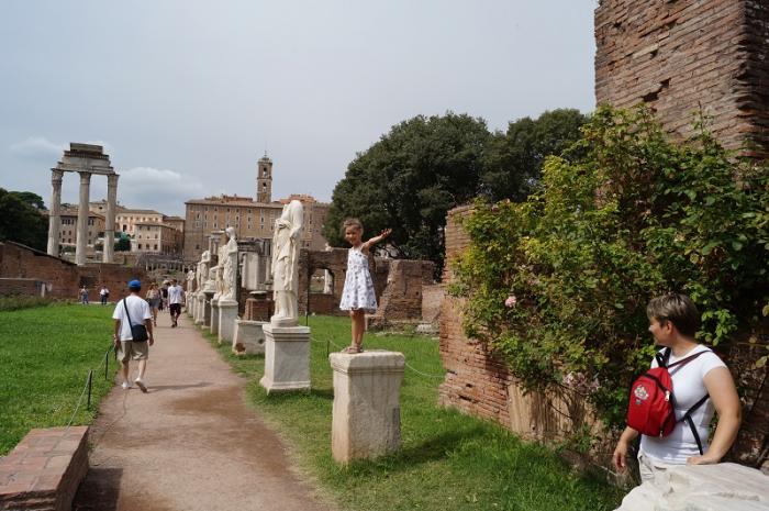 Теперь отправляемся туда, где зародился Рим — римский форум и холм Палантин. Входной билет на римский форум и в Колизей единый (12 евро взрослый, дети бесплатно), но удобнее его покупать на форуме, там очередь короче.