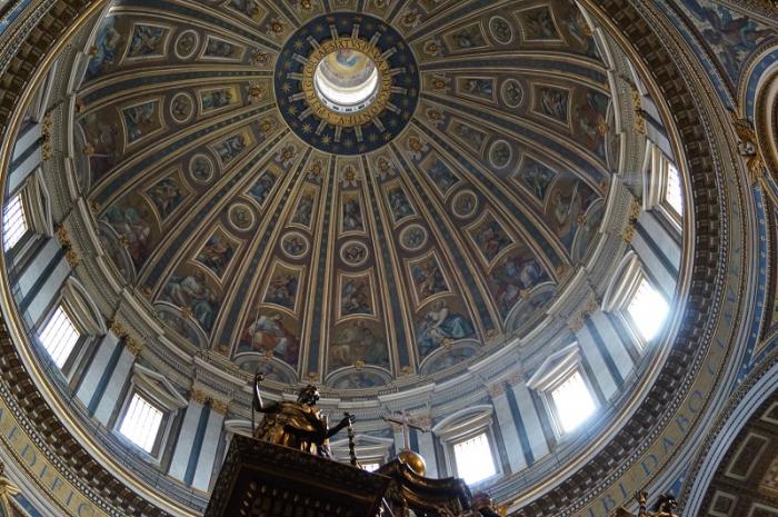 На следующий день мы отправились в Собор Св. Петра. Вход в собор бесплатный — надо лишь пройти сквозь рамки металлоискателей и показать свои вещи грозному дяде. Подъем на купол собора для желающих платный, но за 5 евро топать пешком по ступенькам мы не захотели, хотя по незнанию минут 30 простояли в очереди туда, но потом выбрались и пошли смотреть собор. Нас с дочкой пустили внутрь, а нашего папу нет!!! Им не понравилось не то, что он в шортах, а то, что у него футболка без рукавов. И мы пошли вдвоем. Но для русского человека нет преград и, вскоре наш папа присоединился к нам, войдя через выход. Правда потом пришлось следить за перемещением охранников, чтобы не попасться им на глаза. Ну это мелочи, а сам собор ОБАЛДЕННЫЙ!!!