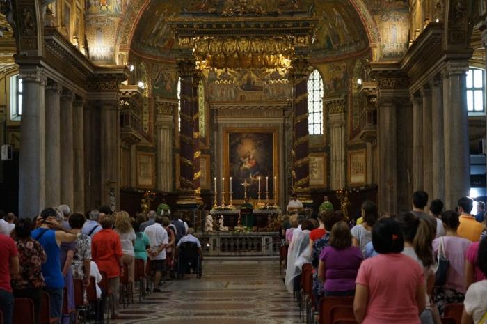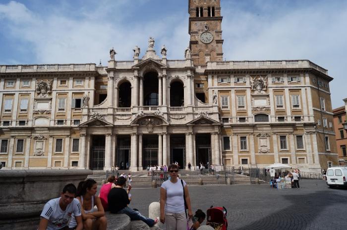 Позавтракав, мы отправились на метро до станции «Термини» (еще раз хочется заметить удобство римского метро — все достопримечательности находятся в шаговой доступности от станций). Первым делом отправились посмотреть базилику Санта Мария Маджоре. В Инете многие восхищаются ее красотой. Не хочу никого обидеть, но базилика на Площади чудес в Пизе нам понравилась больше, ну а Собор Св.Петра вообще вне конкуренции, вот где можно стоять с раскрытым ртом от восхищения, удивления и еще кучи всяких эмоций. А Санта Мария Маджоре так себе рядовая базилика, смотрите сами.