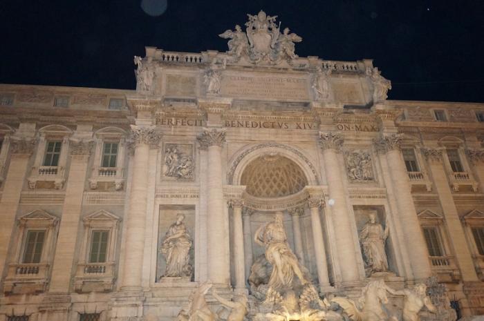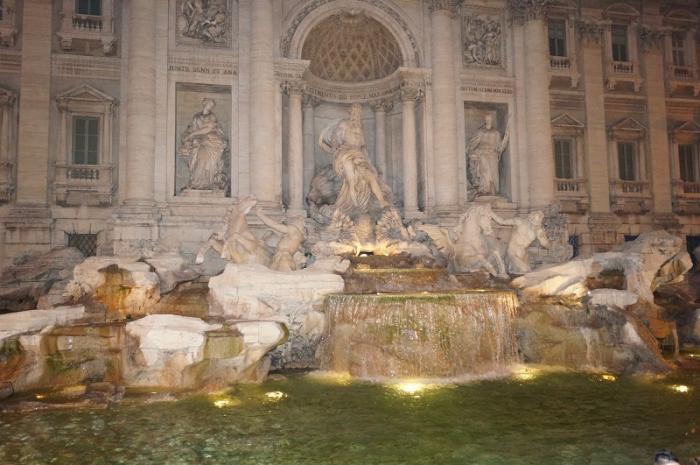 Вечером опять отправились гулять. Решили посетить фонтан Треви, в который обязательно бросили монетки, чтобы когда-нибудь вернуться в Рим. Этот фонтан находится на фасаде здания вечером он подсвечивается. Вокруг очень много людей, которые сидят на ступенях едят пиццу. Мы не стали исключением и тоже приобрели пиццу в кафе у фонтана, было очень приятно, что с нами поговорили на русском языке.