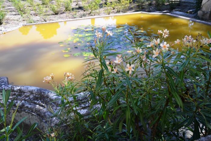 На всем в этом саду (водоем с высокими каменными краями, увитая цветами беседка, каменные скамьи) лежит отпечаток времени: