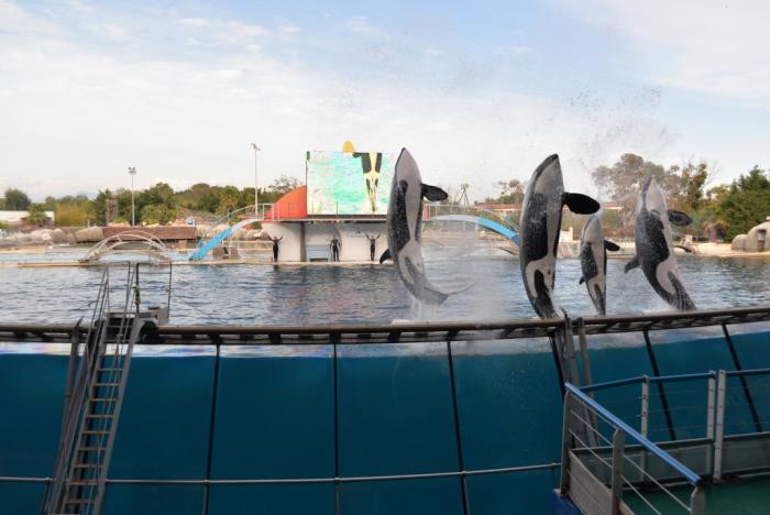На парковку морского парка Маринеленд попали через шлагбаум – сразу 7 евро. Билеты – 39 евро с человека. При оплате парковки по билету в парк семь евро минусуются. В отличие от Тенерифе, в Антибе всего два шоу касаток в день, первое нам надо было ждать три часа, второе было совсем к вечеру. В целях экономии времени мы решили пойти на второе шоу, а время ожидания провели в Биоте, Вансе и на пляже. Может, из-за несезона, посетителей было крайне мало. Если на Тенерифе перед началом шоу зрителей развлекают приколами на большом экране над бассейном, то здесь направленность была более серьезная: нам предложили подумать над вопросами о весе, метраже и аппетите орков.