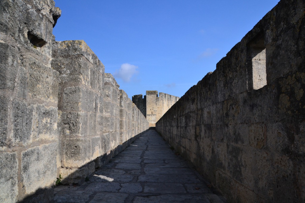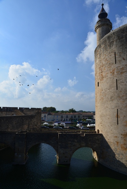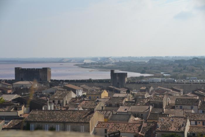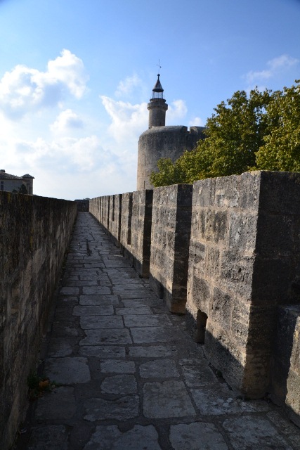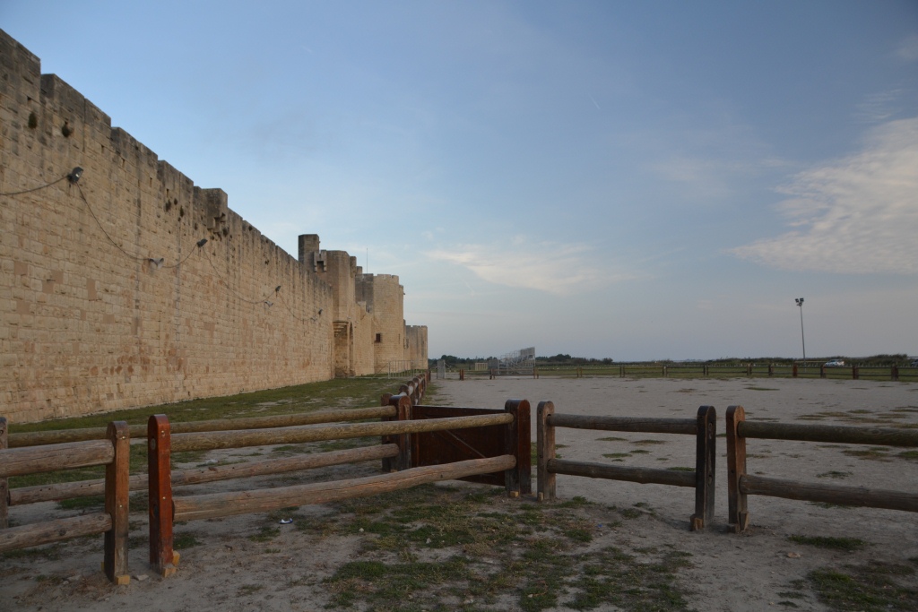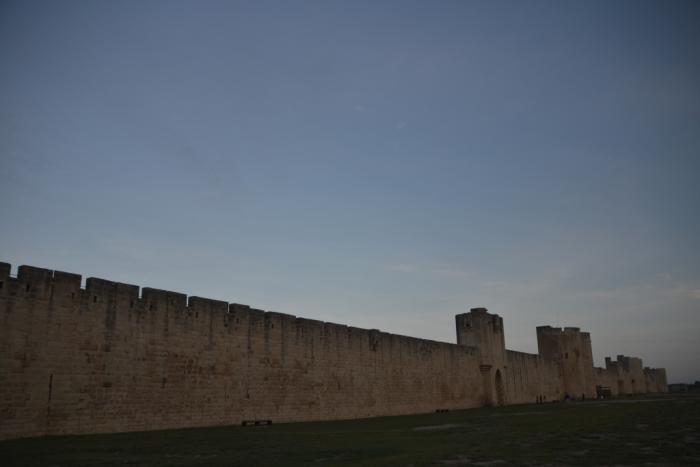 Это поселение — одно из самых характерныхпримеров укрепленных средневековых городов. Он полностью окружен четырехугольной стеной со сторожевым проходом поверху, с 20 зубчатыми башнями и 10 воротами. Стену начал строить Людовик IX перед Крестовым походом 1248 г., наняв для этой цели генуэзцев Никола Коминелли и Гульельмо Бокканегра, а закончена она была его сыном. Филиппом III Храбрым. В север-западном углу стены стоит, изолированно от остальных, Башня Констанс (TourdeConstance), мощный донжон цилиндрической формы, высотой 52 метра, соединенный со стеной мостом, и служивший маяком во времена морской активности города. В течение пяти веков она была даже тюрьмой: здесь томились тамплиеры, гугеноты, политические заключенные. Самым знаменитым узником была женщина, Мари Дюран, упорная поборница протестантской веры, просидевшая здесь 38 лет».