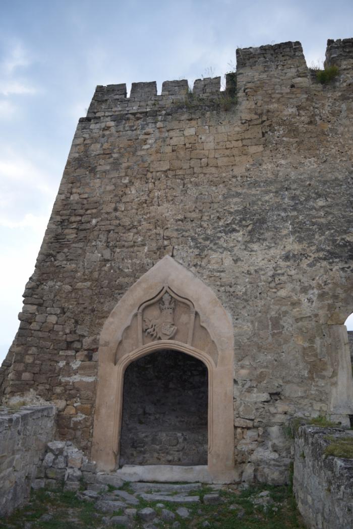Герб королевской династии до сих пор сохранился над готическим порталом, через который королевская знать въезжала в крепость. Портал давно замуровали во время укрепления стен, а сам герб по неизвестной причине изображен зеркально.