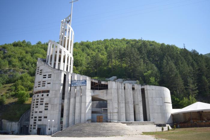 Рядом со старой церковью строится новая, модерновая. Здание церкви вместе с колокольней завернуты в спираль: 33 столба, где каждый означает год жизни Христа. А в долину, где совершается месса, паломники входят через торжественный портал.