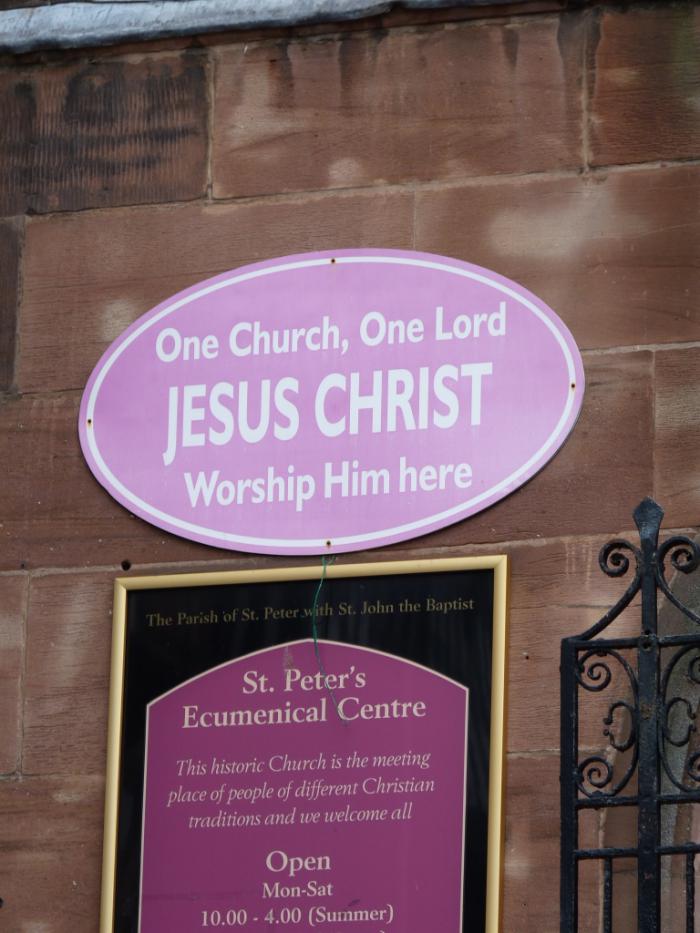Плакат на «экуменической церкви» напоминал, что Церковь — едина, Господь Иисус — один для всех, но поклоняться Ему стоит именно здесь. Типичный подход. =)