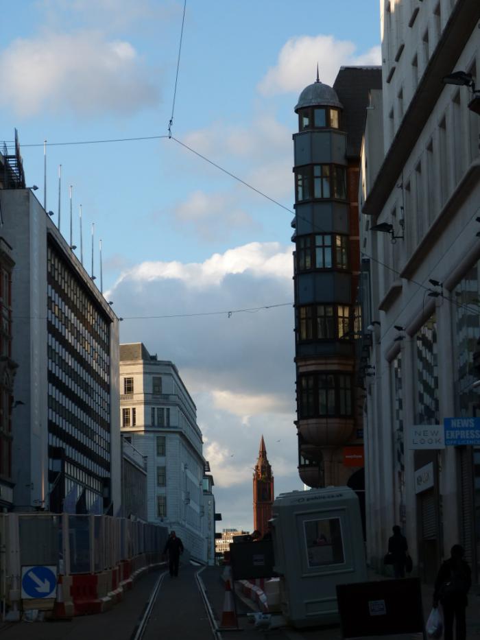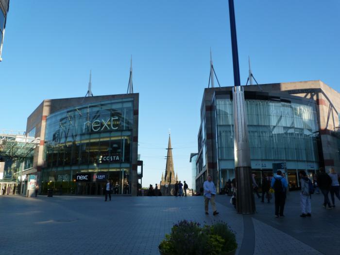 А следующий ракурс Дэйв хотел нам показать специально. На фотографии видна малая часть нового колоссального торгового комплекса Bullring — вроде бы, его здесь называют Сфера. Комплекс уходит под землю, смыкаясь там в единое пространство и лишь отдельными островами дорогих магазинов, ресторанов и офисов выбираясь на свет. А между этими современными зданиями затерялась старинная церковь St Martin in the Bull Ring (известная с XIII века, хотя серьезно перестроенная впоследствии) — когда-то основная доминанта этого района города.