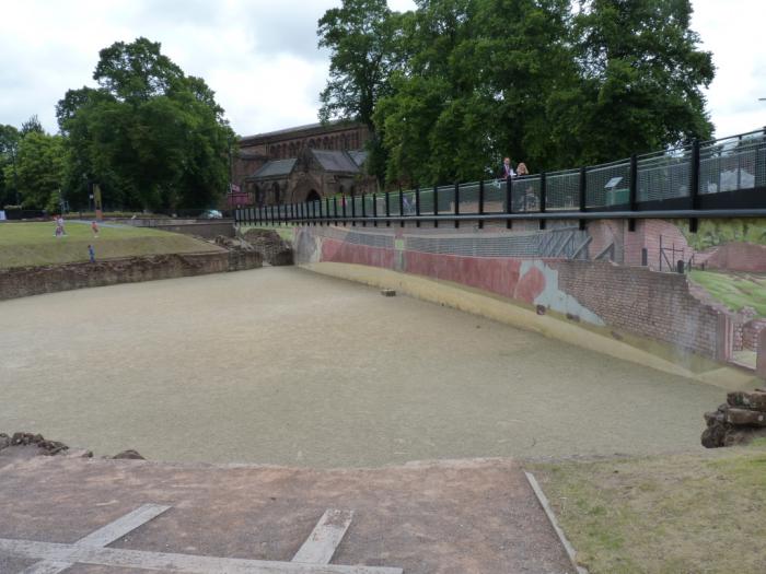 А ведь когда-то этот театр вмещал не менее 7000 зрителей и должен был потрясать воображение окрестных варваров. Некоторые историки даже предполагают, что «круглый стол» короля Артура — это никакой не стол, а как раз здешний амфитеатр и есть. То есть был. Кстати, при раскопках, которые всерьез начались здесь только в 2000-х, нашли дешевую керамику с изображением гладиаторов и предположили, что Честер стал одним из первых мест, где зрителям на состязаниях предлагали приобрести сувениры. =)