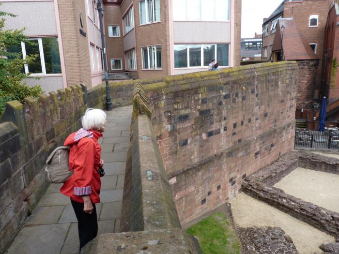 Штурм ворот увенчался успехом, и дальше мы продолжили исследование города Честера прогулкой по крепостной стене. Город изо всех сил пытается выставить напоказ свои римские регалии, как располневшая красавица, демонстрирующая гостям свои прежние наряды. В каждой башенке, куда мы периодически прятались от дождевых залпов, тут же включалось аудио-сопровождение, и нам начинали рассказывать захватывающую историю римского легиона или, на худой конец, какой-нибудь средневековой принцессы. А вдоль стены были рассыпаны выкопанные доказательства, что свое имя Честер носит не зря.