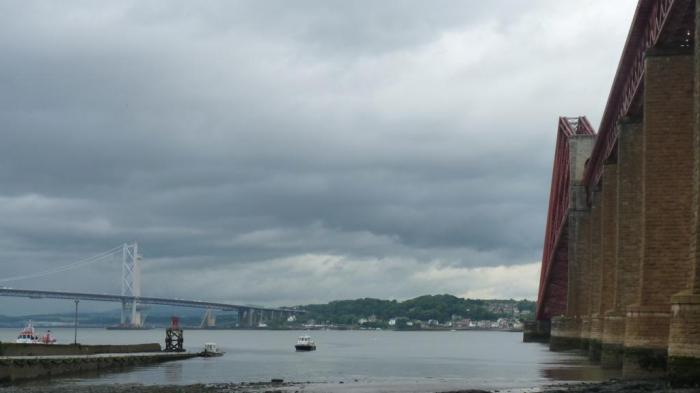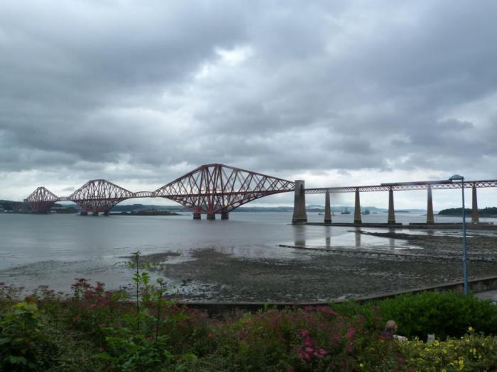 К 9:45, пробравшись через Эдинбург, мы доехали до Queen’s Ferry возле длиннющего залива Firth of Forth, на котором расположена столица гордых скоттов. Вопреки названию, смотрят здесь не паром, а мост. Или, если верить многочисленным рекламным вывескам, целых три моста.
