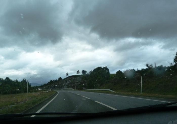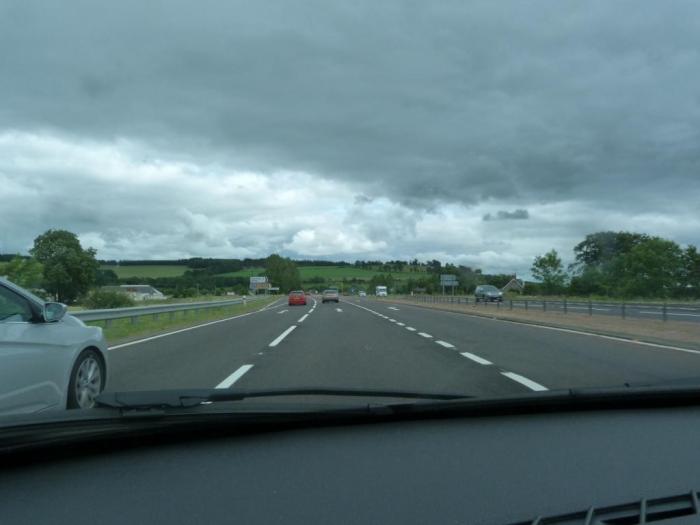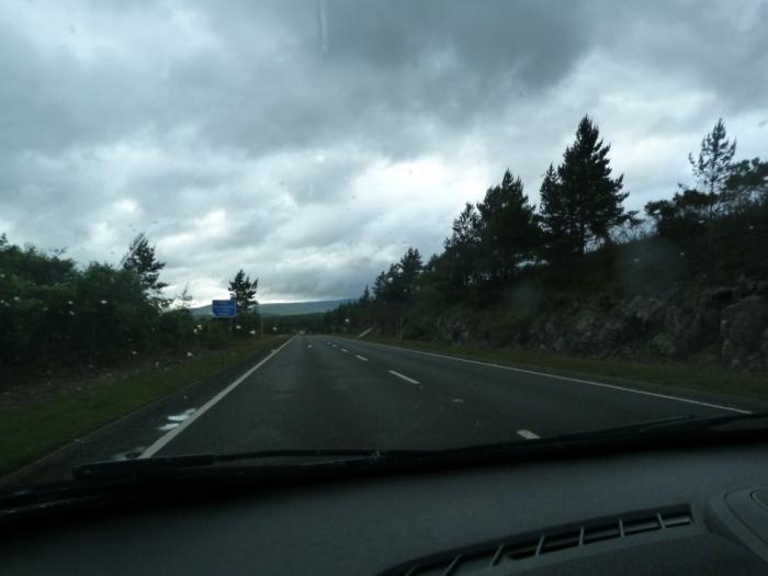 Маршрут ведет нас уже по трассе А9 в сторону очень мрачных туч на горизонте. И чтобы окончательно испортить нам настроение, огромные информационные табло заботливо оповещают путешественников о «Heavy rain forecasts» — т.е. прогнозах на проливные дожди. :(