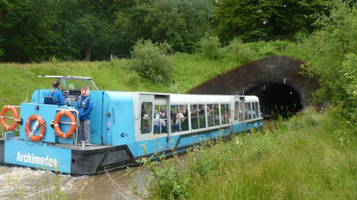 Пассажиры смотрели на мой забег вдоль канала с легким недоумением и любопытством: попытаюсь ли я и в туннель за ними нырнуть? Но свое любопытство я уже удовлетворил. Ограничился тем, что забрался на холм, под которым проходил туннель. Попутно, как выяснилось, покорив еще один римский оборонительный вал! Тоннель, в который ушел наш катер, проходит под валом Антонина — укреплением римлян, насыпанным ими к северу от Адрианова вала. Впрочем, это я узнал уже при подготовке отчета. Тогда же мне интереснее было сфотографировать с вала новый катер, закончивший прогулку и готовящийся к возвращению на базу.