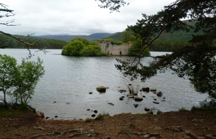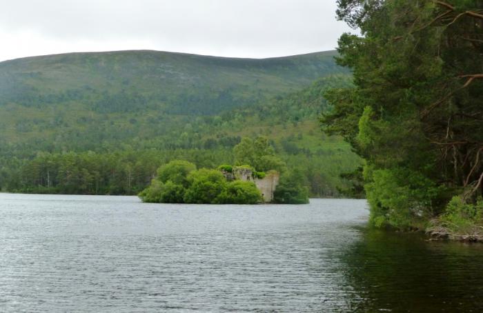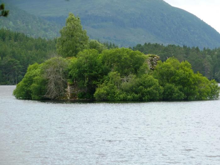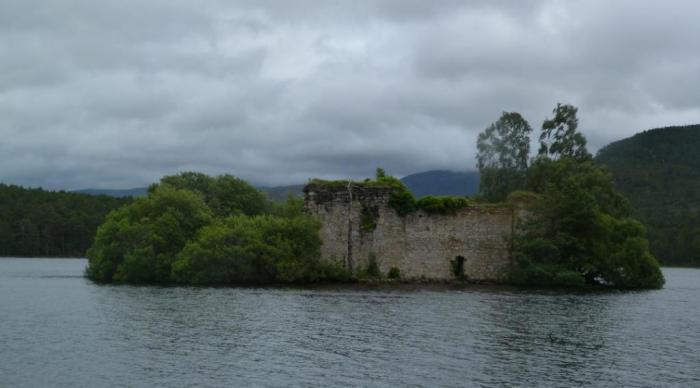 Если честно, все 4 мили тропы вокруг озера мы не одолели. Не устали, просто мама нервничала, что опоздаем на фуникулер и наша утренняя программа сильно затянется. Так что, составив первое впечатление о большом и симпатичном лесном озере, мы отправились к тому его берегу, с которого нам обещали виды на руины замка на островке. Собственно, название озера означает «озеро острова». Веке в XV на островке здесь был построен небольшой замок, до искуственного повышения уровня воды в конце XVIII века — соединенный с берегом зигзагообразной насыпью. Замок разок выдержал осаду вездесущих якобитов, отступавших после очередной проигранной битвы, а во время их последней попытки восстановить изгнанную династию на троне — здесь прятались беженцы. Но потом крошечную крепость просто забросили за ненадобностью и забыли, пока авторы путеводителей не нанесли руины на карты, чтобы привлечь туристов.