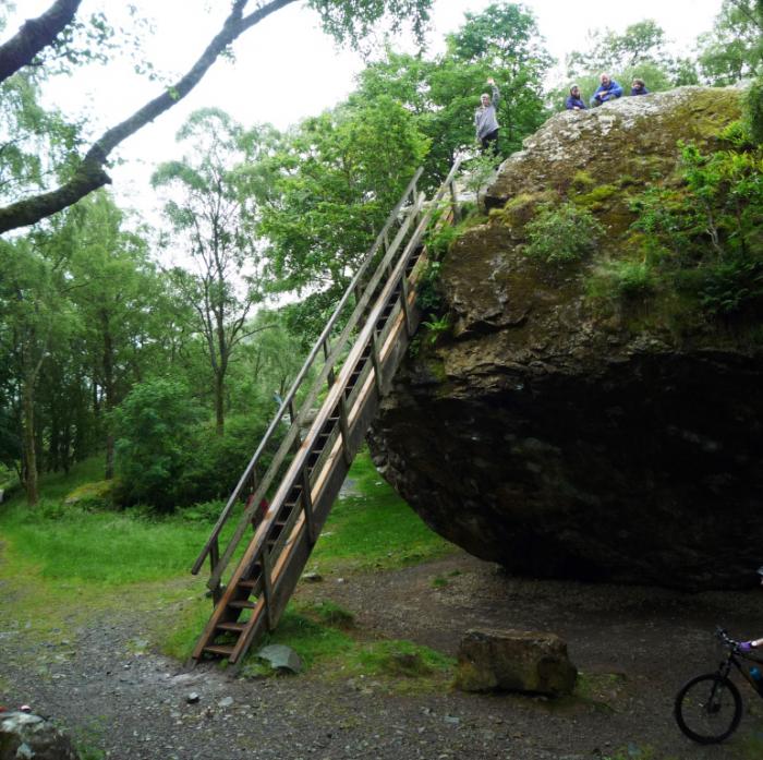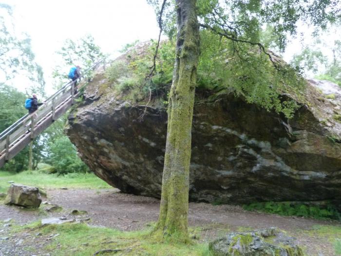 А вот, наконец, и Bowder Stone показался. Глыба высотой 9 метров и весом в 2000 тонн не осталась незамеченной предприимчивыми британцами. Еще в 1780-х годах некий Джозеф Поклингтон поселился у этого озера, построил коттеджи и начал рекламировать выдающийся булыжник. Для привлечения туристов он поставил лестницу наверх, придумал традиции, например, пожимать руку другу через естественную арку, образовавшуюся под камнем и т.д. Сейчас есть любители карабкаться наверх без помощи лестницы и веревок, но я предпочел традиционный путь, а мама и вовсе довольствовалась осмотром булыжника снизу.