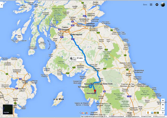Пробег от Motherwell до Keswick 122 мили / 196 км, от выезда до финиша 2:20 часа, средняя скорость движения 85 км/ч
