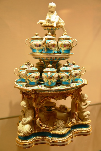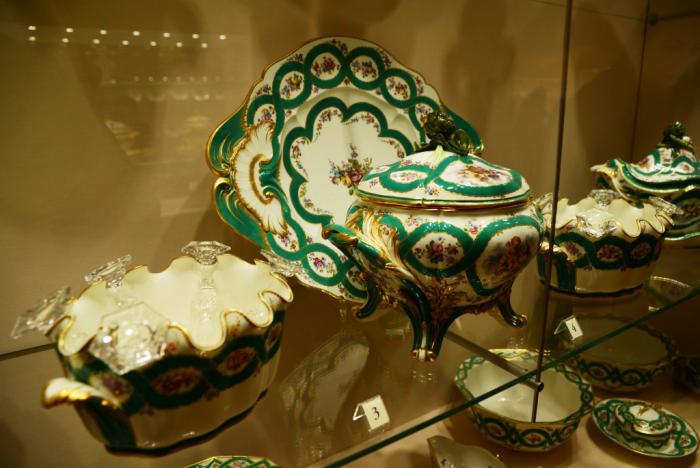 Не считалось зазорным между монархами преподнести в дар фарфоровый сервиз: я уже не помню точно информацию аудиогида, но вот этот бело-зеленый сервиз как-то связан с именем Марии-Терезии, то ли она его дарила своей царственной дочери Марии-Антуанетте, то ли ей его подарили… Не помню.
