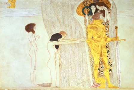 Чтобы увидеть это творение, необходимо спуститься в цокольную часть здания. Здесь, в помещении без окон, на трех стенах разворачивается история, навеянная автору Девятой симфонией Бетховена(работа была создана в 1902 году специально к Бетховенской выставке).