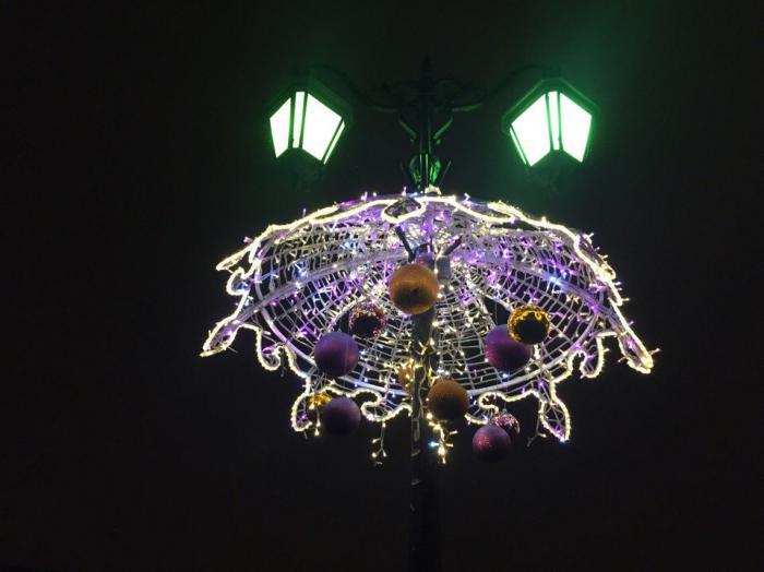 Уличные фонари были украшены необычными то ли зонтиками, то ли юбочками, которые вечером горели и придавали улице волшебное сияние.