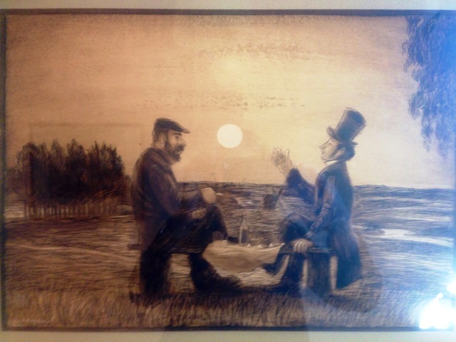 Да, забыла рассказать об атмосферных картинках в коридорах гостевого корпуса: все по теме – Пушкин, Довлатов. Есть двойные портреты: Пушкин с Довлатовым «поддают». «Прямо на лоне».