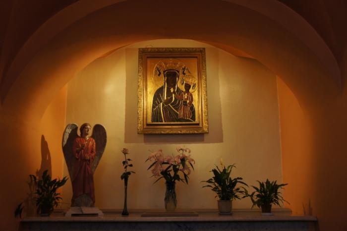 В очередной раз поразило различие отношений к туристам и посетителям храмов католической и православной конфессии. Служащая храма, видя, что мы уже собираемся покинуть его, остановила нас и повела посмотреть старинную икону, которая находилась в отдельном приделе храма. Включила свет, пыталась рассказать ее историю, но языковой барьер не позволил многого понять. В алтарной части сохранилась икона Успения Пресвятой Девы Марии работы Гвидо Рени (XVII), которая была подарена приходу баварским королём Людвигом I. (WiKi)