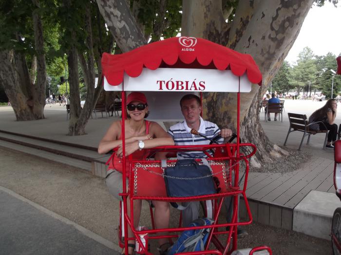 На острове мы взяли напрокат интересный велосипед на 3-х человек за 2180 форинтов, прокатились на нем по парку, получили большое удовольствие.