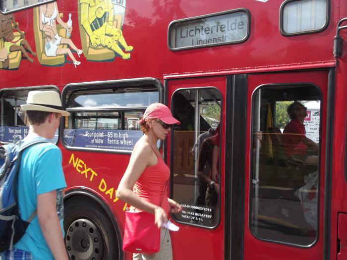 Сдав велосипед мы двинулись с острова на мост, на левый берег Дуная на остановку HOP ON. Увидели плывущий по Дунаю автобус, который передвигается сразу по земле и по воде.