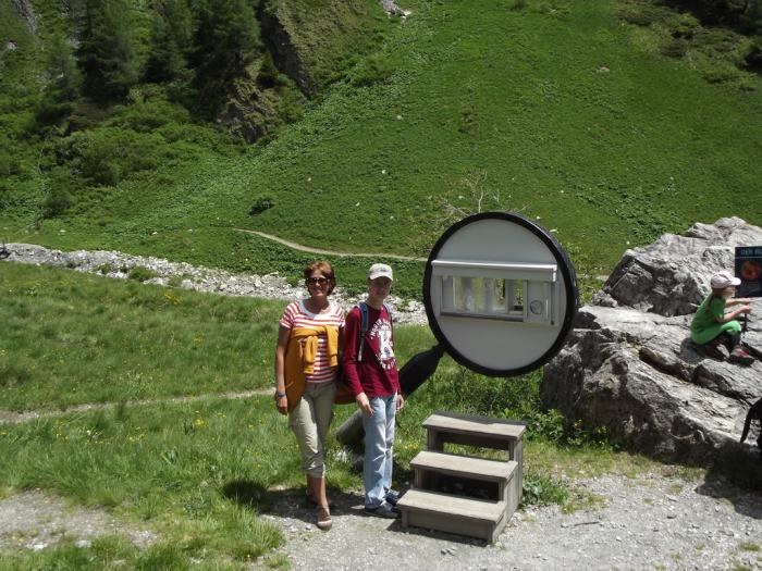 Официант – колоритный пузатый дядечка в возрасте в традиционных шортах и национальной одежде, спросил нас откуда мы, узнав из России, сказал что классно и что он сам из Чехии и им преподавали в школе русский язык, но он все уже давно забыл. Неповторимый колорит кафе, радость от преодоленного пути компенсируют довольно высокий ценник. Умный официант умеет так обыграть подаваемое блюдо, что никаких чаевых ему не жалко. Так поставив каппучино мне, он вздохнул и сказал, что чашечку кофе с такой красивой пенкой должна получить моя жена, так как «самым красивым — самое красивое!» и поменял чашки. Мы полюбовались видами на площадке, покачались на качелях и начали спуск вниз. Надо сказать, что часть обратного пути можно проделать по другой дороге, что мы и сделали. Здесь была уже более узкая и заросшая тропа, где периодически встречались различные информационные книги о растениях. Очень хотели увидеть альпийских сурков, но не посчастливилось, поэтому на нижней стоянке сфотографировал их в сувенирной лавке.