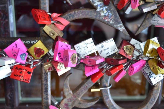 Замочки висят на решетке справа от Джульетты. Продаются тут же в сувнирных лавках (вместе с маркером — именным, между прочим). Записки нынче, насколько я слышала, караются штрафом в 500 евро. Но все равно что-то там лепят и пытаются разрисовывать.